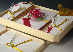 | 内容 | 熨斗、末広(男性用モーニング扇子・女性用黒塗り扇子)、祝儀袋、水引の飾り、祝儀台、目録、片木 |