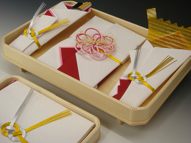 | 内容 | 熨斗、末広(男性用モーニング扇子・女性用黒塗り扇子)、祝儀袋、水引の飾り、祝儀台、目録、片木 |