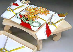 | 内容 | 熨斗、末広(男性用白扇・女性用金銀扇子)、祝儀袋、水引の飾り、扇面台、目録、片木 |