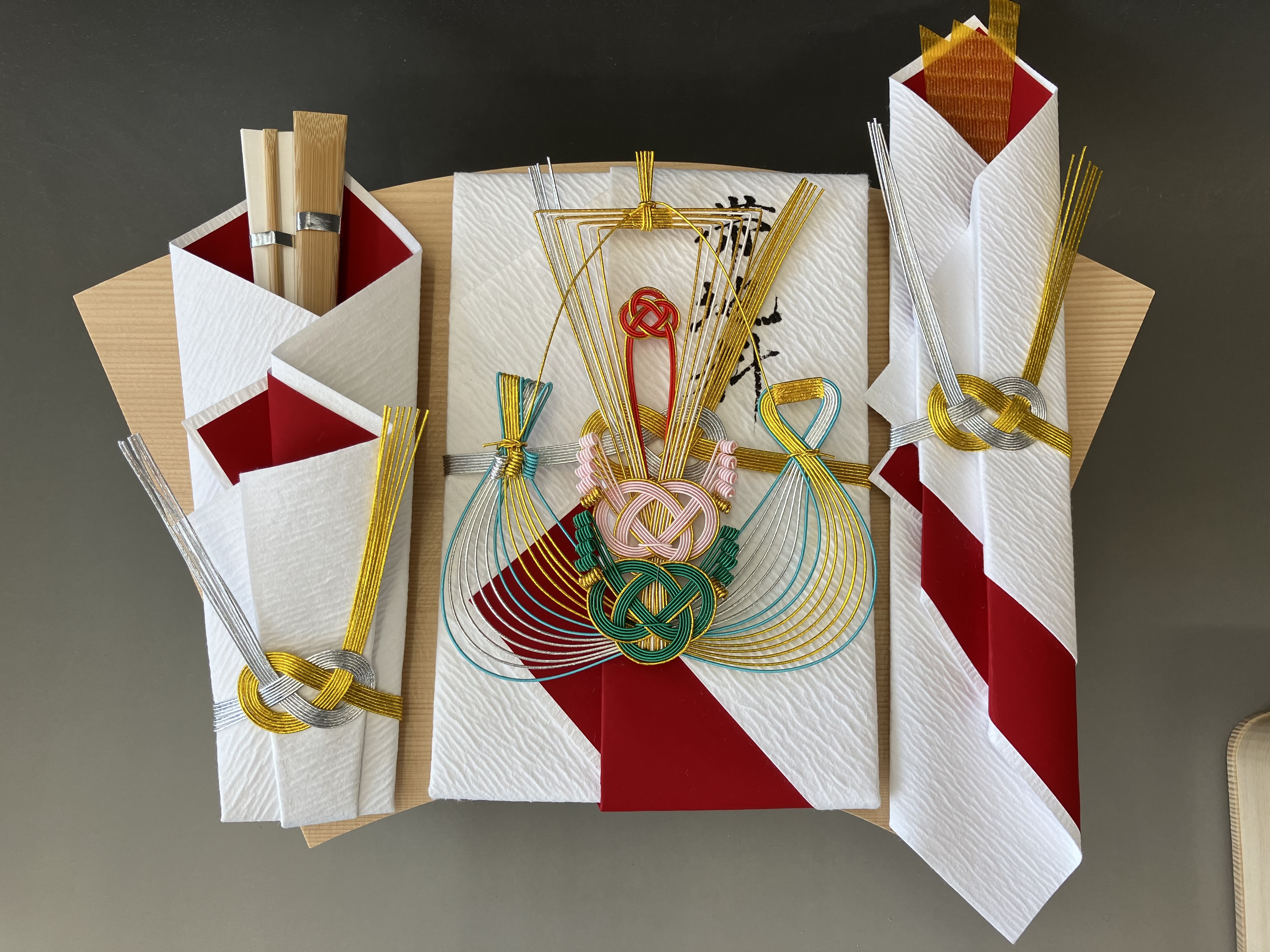 | 材料 | 手漉き檀紙、顔料染め赤紙、水引、本熨斗、手漉き奉書(桃色) |