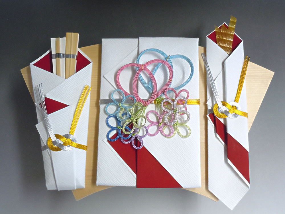 | 材料 | 手漉き檀紙、顔料染め赤紙、水引、本熨斗、手漉き奉書(桃色) |