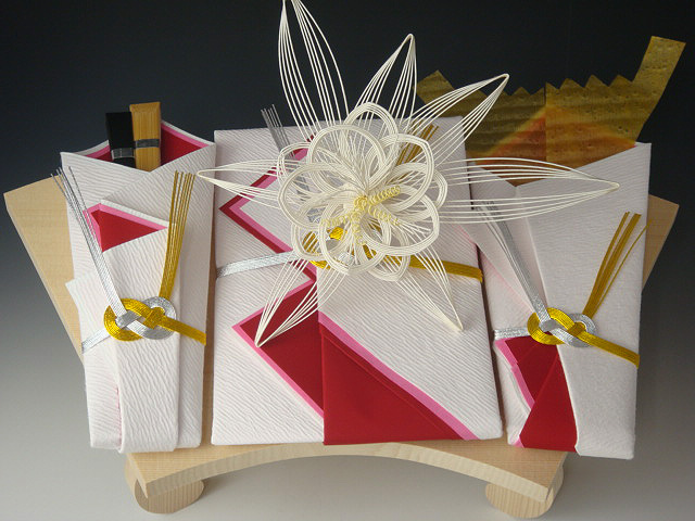 | 内容 | 熨斗、末広(男性用白扇・女性用金銀扇子)、祝儀袋、水引の飾り、扇面台、目録、片木 |